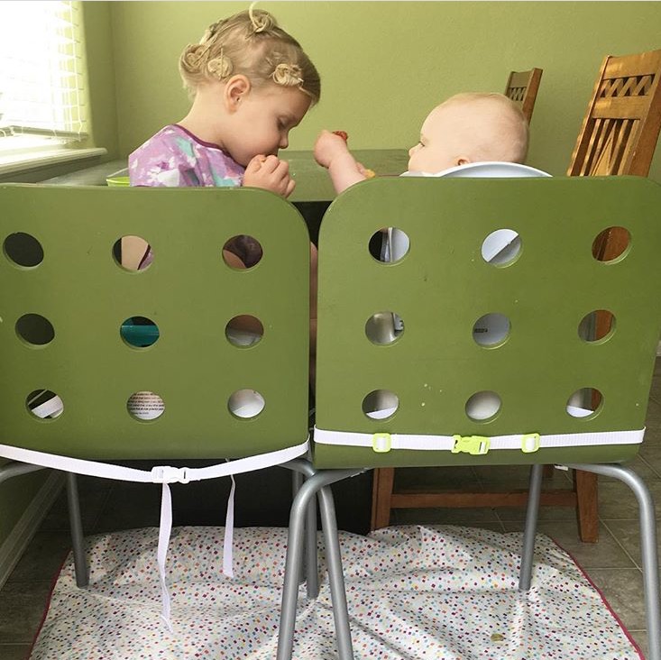 Thank goodness I had my Bumkins Splat Mat ready to catch all of the mess! Josie (2.5 years old) is learning to keep her food on her plate, but the Splat Mat saves me a lot of sweeping and mopping after Nova’s meals. I lay it down under her chair before her meal then I shake the crumbs into the sink before tossing in the washing machine. It’s like a giant bib for the floor! Sometimes I even sit these sweet sisters next to each other and they both fit under the Splat Mat. They are too cute sharing their meals!