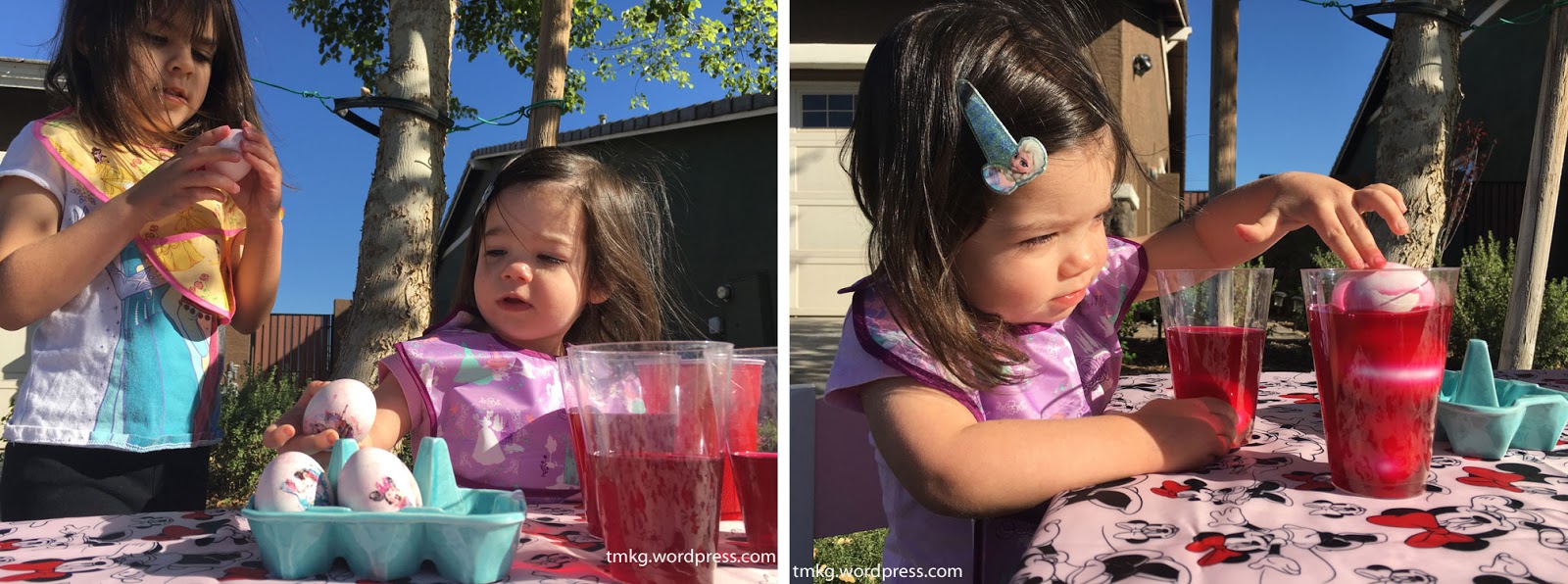 Both Peanut, 2, and Pumpkin were able to participate in our next activity. For the past couple of years, we have dyed our Easter eggs using beets (pink), purple cabbage (blue), and turmeric (yellow). For our princess-theme, we did some just with beets.