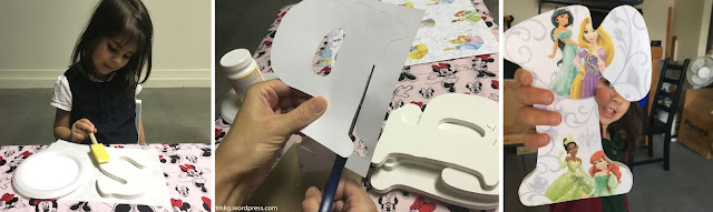 Pumpkin selected which pattern would be used for each letter. Following the instructions from a tutorial I found online, the first step was to trace the letters onto the paper, placing the letter face down on the back of the scrapbook page). After cutting out the shape with scissors, I then lined the paper up with the block letter and trimmed the excess with an Xacto knife. Once this was done, Pumpkin used a sponge brush to coat Modge Podge onto the front of the letters. The Modge Podge was dripped all over the Minnie Mouse splat mat, but easily peeled off once dry. After each letter was coated, I placed the paper on top and smoothed it out. After watching me do it a couple times, Pumpkin asked if she could place the paper, too.