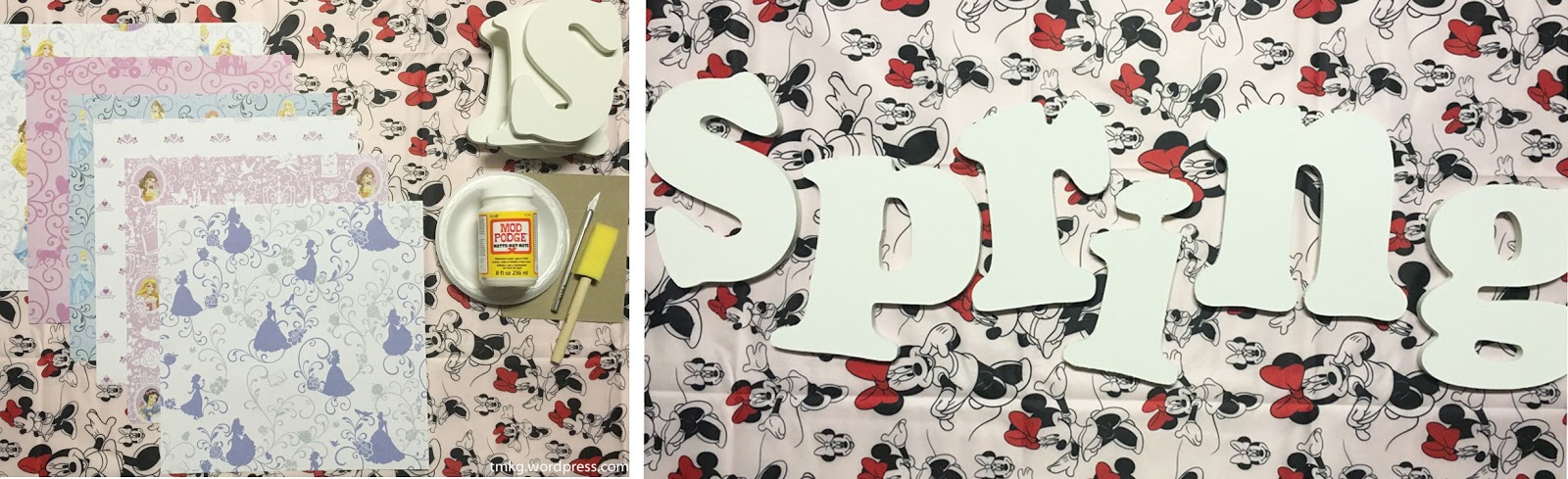I thought a fun project Pumpkin, my 4-year-old, and I could do together would be to create the word “Spring” with wooden block letters and personalize them using scrapbook pages featuring her favorite Disney princesses.