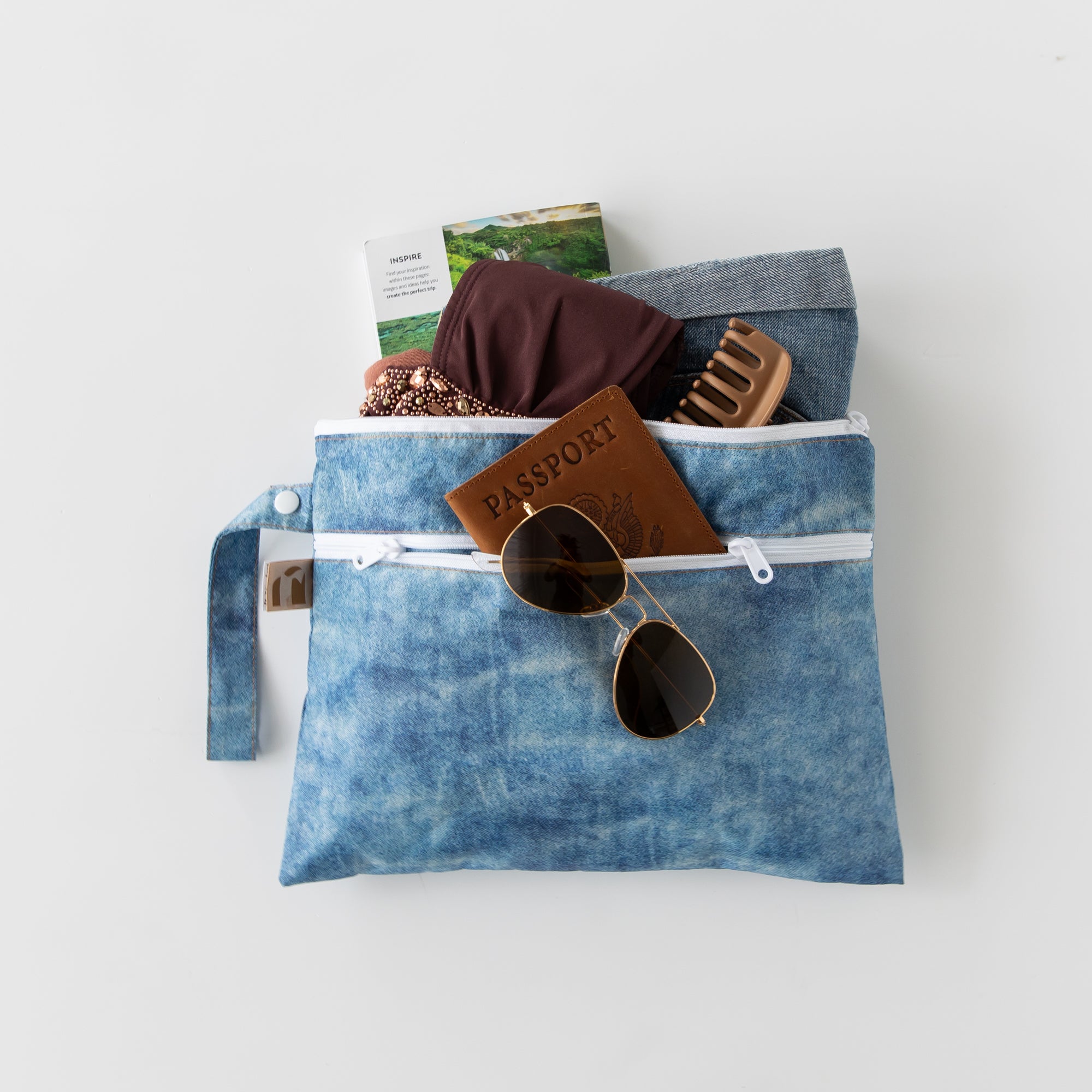 • Wet/Dry Clutch includes two zippered compartments—one for clean items, one for messy ones