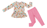 This adorable peplum set features a whimsical equestrian print with graceful horses, riding boots, florals, and sweet stable-inspired details. The flouncy peplum top pairs perfectly with comfy matching leggings—both made from Birdie Bean's signature bamboo blend for buttery softness, breathable stretch, and all-day comfort. It’s the perfect outfit for playdates, pony rides, and picture-perfect adventures.