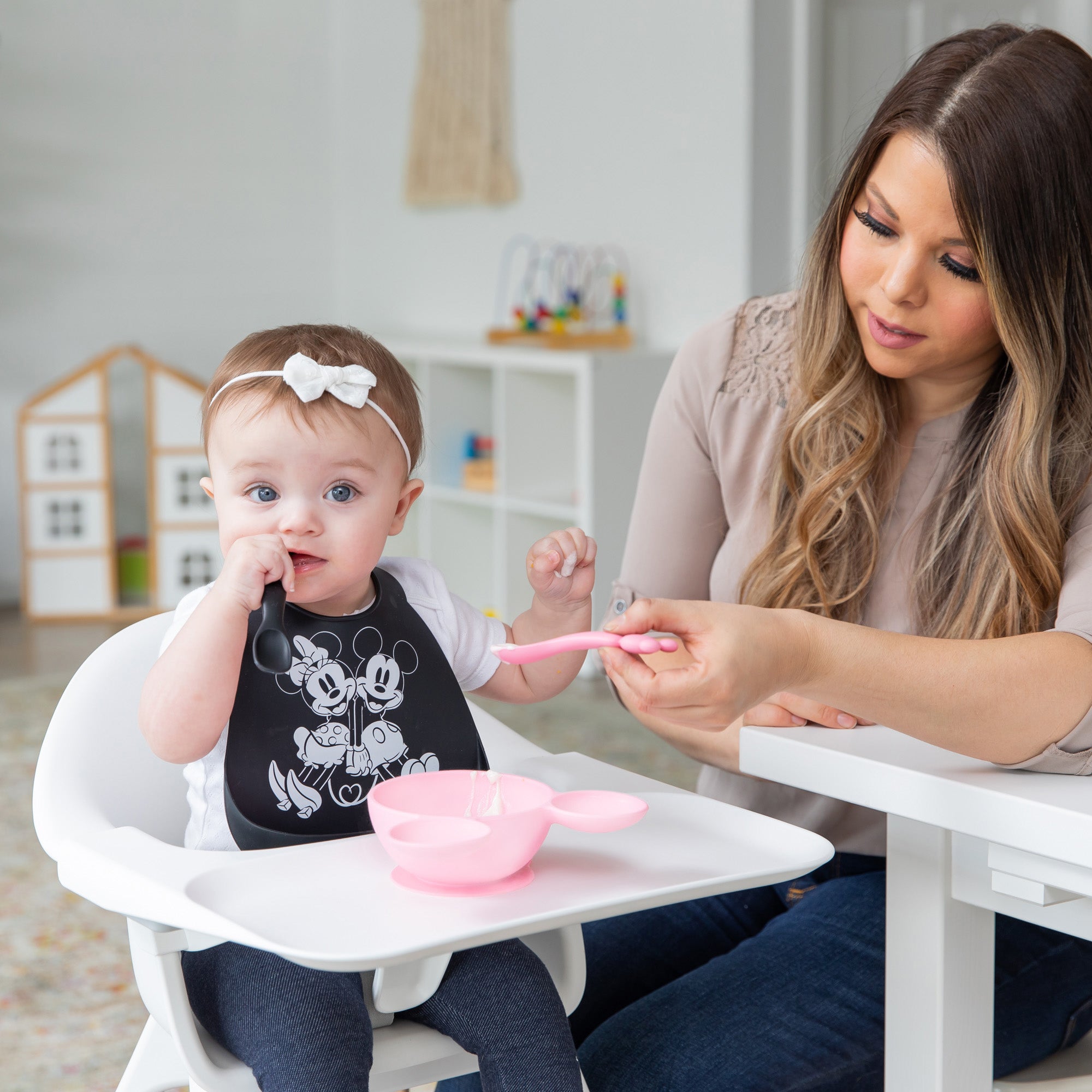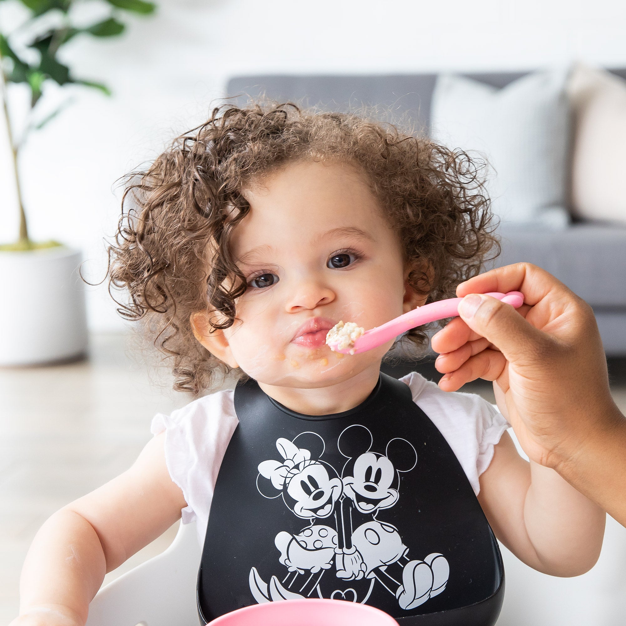 Introduce baby to the world of self-feeding and utensils with this set of starter spoons featuring the iconic shape of Mickey and Minnie Mouse’s ears. Made from 100% food-safe silicone that is gentle on gums, these spoons are the ideal size for a baby to begin the motions of self-feeding while under the supervision of an adult. With two in a set, there are enough spoons for both caregiver and baby to have one in hand and avoid any power struggles with independent eaters. Spoons can be used with the Bumkins Silicone First Feeding Set: Minnie Mouse or separately. Easy to clean by hand and dishwasher safe.