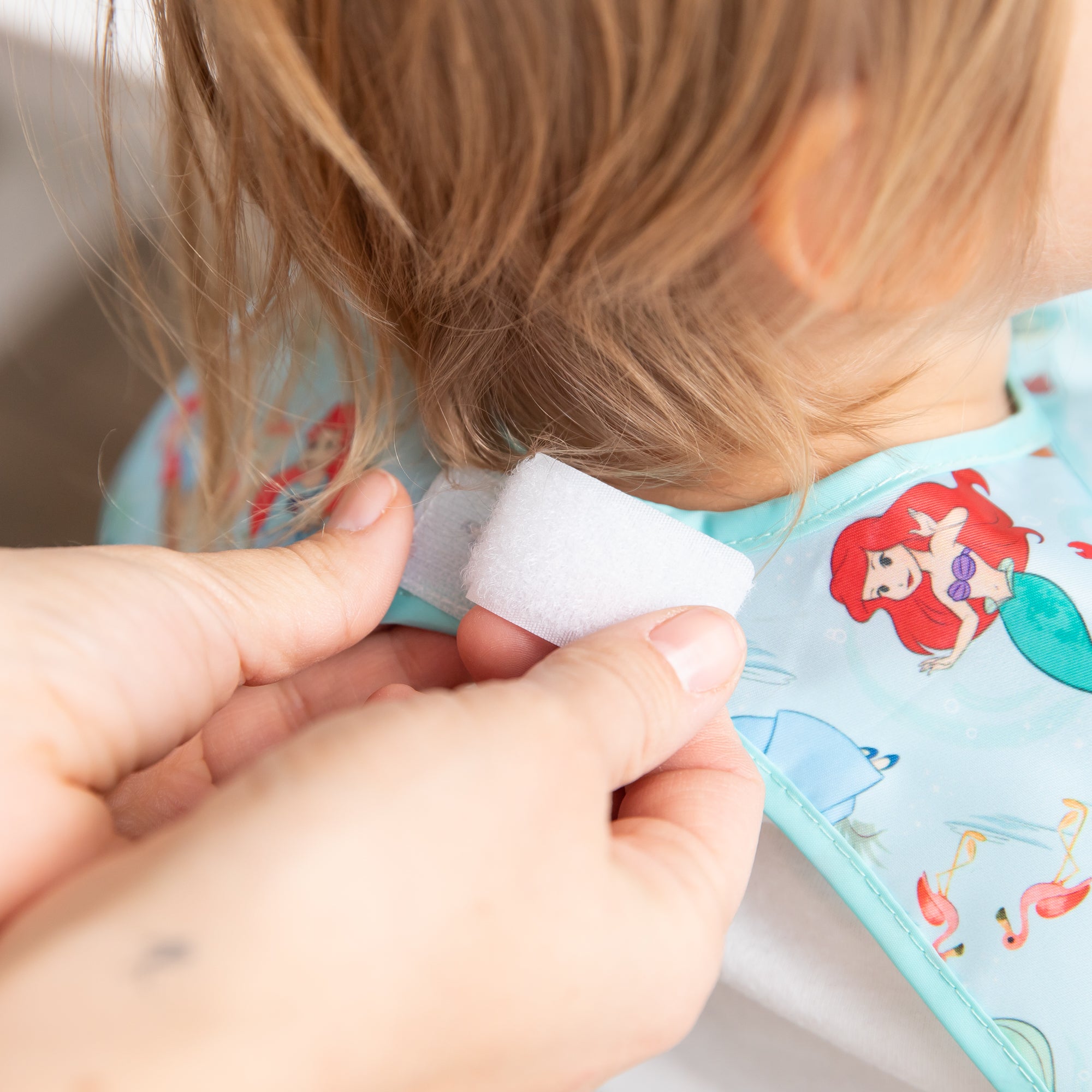 Parents, your wish is our command. Messy toddlers won’t realize they’re wearing a bib as they slip on this Princess Ariel short-sleeved cover that features a large catch-all pocket to help contain spills, crumbs, and more. The back hook-and-loop closure allows for a quick, adjustable, and tug-proof fit. Wipeable and machine washable for easy cleaning so you can use it over and over again!