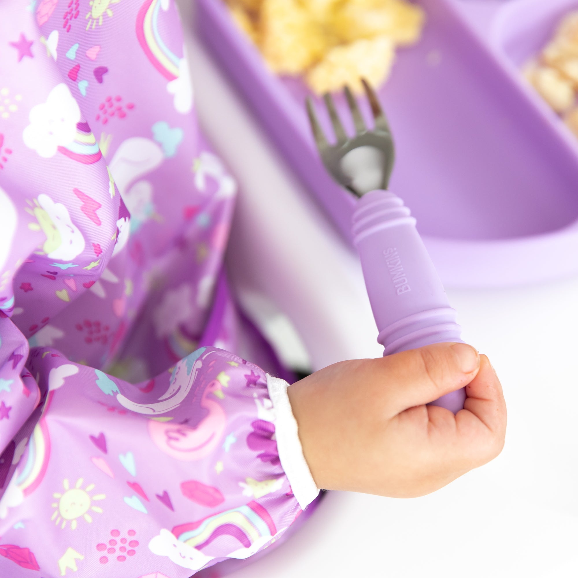 Little ones can dig into mealtime with our calming lavender Spoon + Fork Set. Stainless steel fork and spoon heads are sized and shaped for toddlers. The concave heads help keep food on the fork or spoon, helping promote self-feeding with solid foods. The outer fork tines are bent to help spear foods and keep food on the fork. Handles are textured silicone so they’re easy-to-grip. Safe to use – made from 100% food-safe silicone.