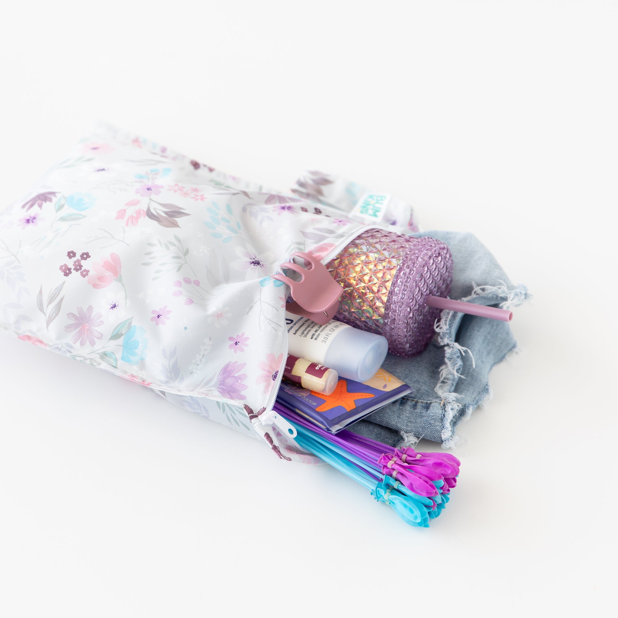Stow messy or dirty clothes in style with this floral-print Wet Bag. The better alternative to stashing things in plastic grocery bags, our reusable Wet Bags are made from the same waterproof fabric as Bumkins award-winning SuperBib. Our bags feature heat-sealed seams for true waterproof protection. A smooth zipper closure locks away the mess, and single-ply construction means no worrying about icky stuff growing between layers of fabric. Wet bags are great for carrying diapers, dirty gym clothes, and wet swimsuits. Not just for wet stuff – these bags make excellent organizers for toys, accessories, toiletries, electronics, travel, and more! With a snap handle, snap your bag wherever you need it – stroller, changing table, or suitcase. Bags are single compartment, non-gusseted, non-insulated, and non-stretch.
