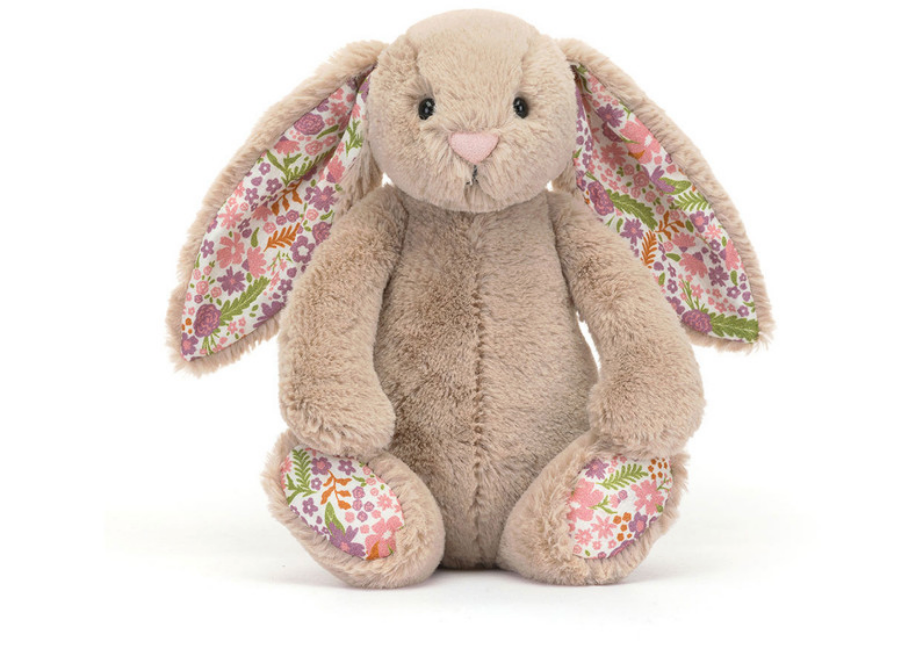 Blossom Beige Bunny has been frolicking in the meadows, and has found some special flowers. In iconic Bashful beige fur with a cream bobtail, Blossom Beige Bunny has soft cotton floral ears and feet, printed with an original Jellycat design of pink and purple flowers. Bringing floral patterned joy to all ages!