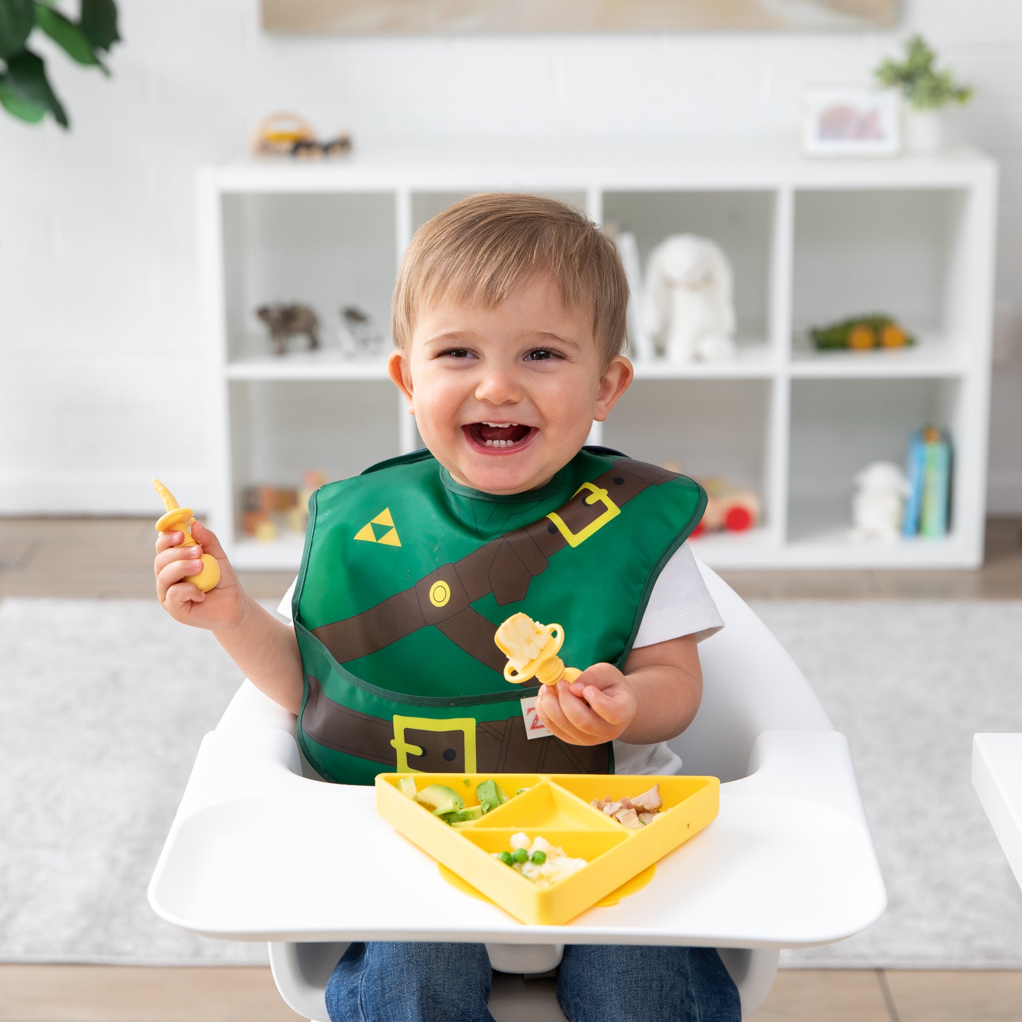 There's an eternal quest to keep kids’ clothing clean during meals. The Legend of Zelda™ Link SuperBib® will save you from the mess! The bib attaches over the back of the shoulder with hook and loop for a quick, adjustable and tug-proof fit. With a handy crumb catcher / catch-all pocket for containing spills. Then snap on the cape for your little super hero! Made from Bumkins lightweight, waterproof, easy-wipe, stain and odor resistant fabric. Single ply construction means no worrying about icky stuff growing between layers of fabric. Without a cotton layer, stains and smells don't stick. Wipeable and machine washable for easy cleaning so you can use it over and over again!