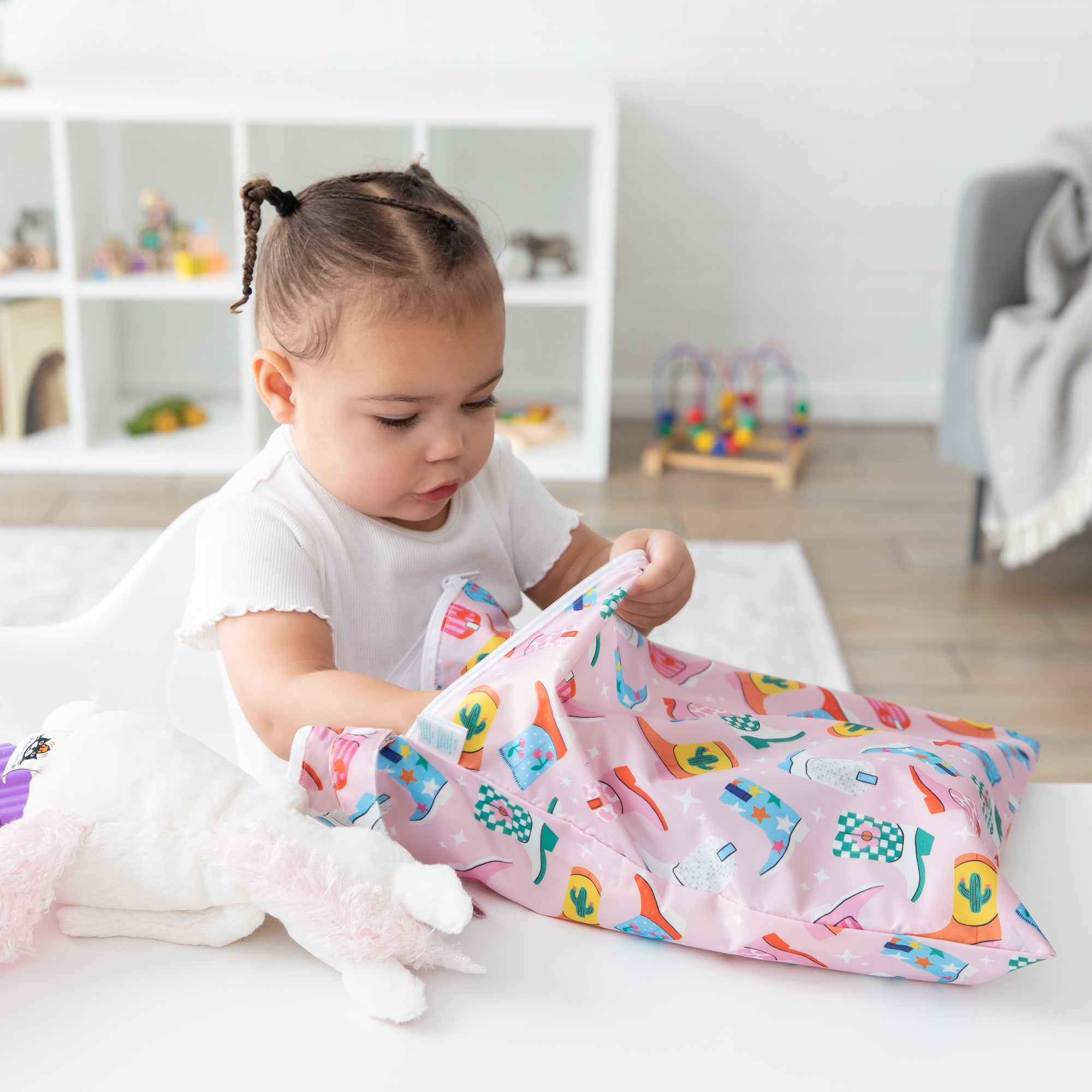 When it's time to hang up your boots for the day, Bumkins has you covered with the Wet / Dry Bag in boots print. The better alternative to stashing things in plastic grocery bags, Bumkins Wet/Dry Bags are made from the same waterproof fabric as our SuperBib. They have two zippered compartments to keep wet and dry items separate. Heat-sealed seams provide true waterproof protection and help lock away odors. Use Wet/Dry bags for carrying diapers, dirty gym clothes, beach gear, dirty shoes, or wet swimsuits. These bags make excellent organizers for toys, accessories, toiletries, electronics, travel and more! With a snap handle, snap your bag wherever you need it – stroller, changing table or suitcase. Bags are non-gusseted, non-insulated and non-stretch.