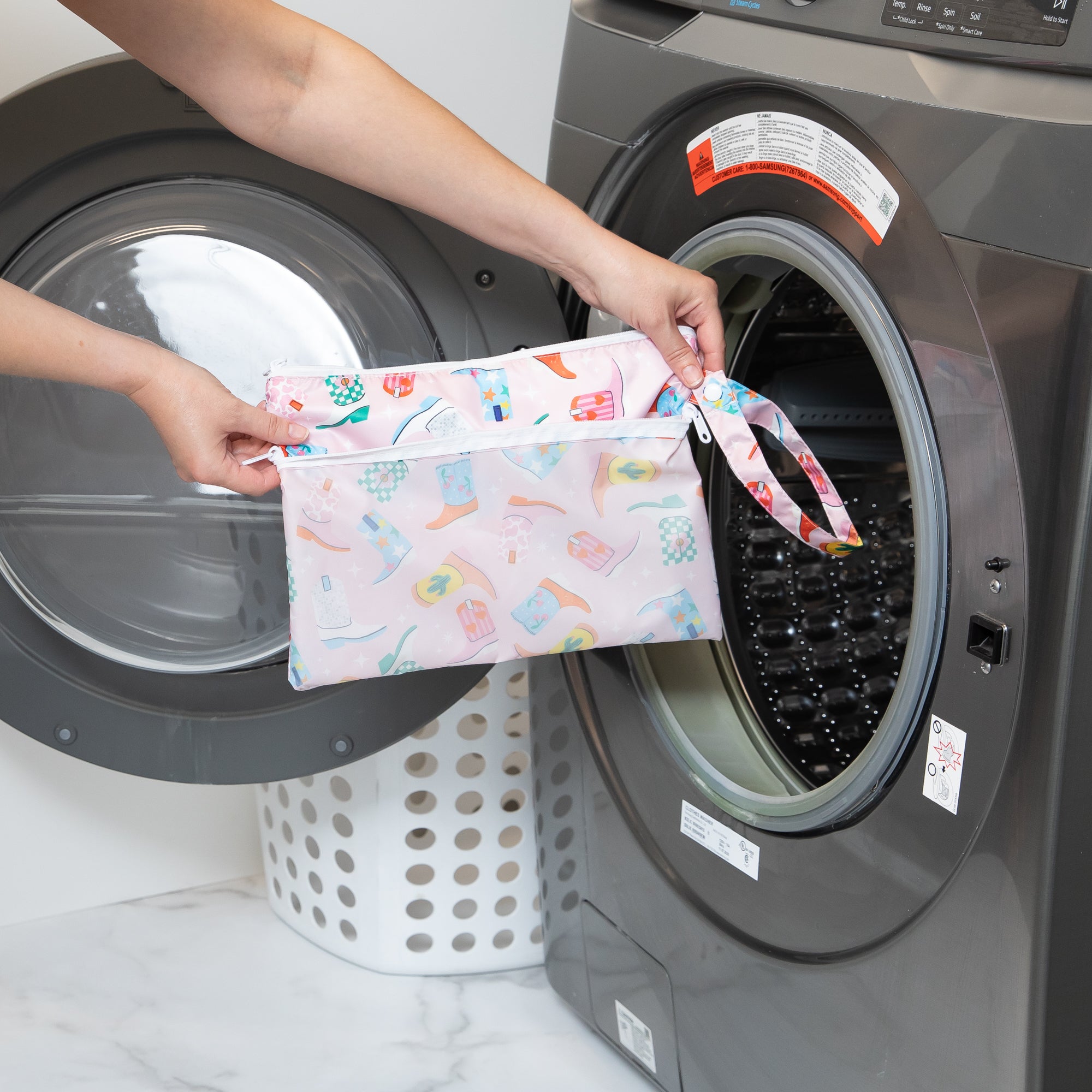 • Wet Bag – A single-ply waterproof bag ideal for diapers, swimsuits, extra clothes, or travel essentials. Perfect for keeping clean items dry and discreetly contains soiled ones. 12" x 14"