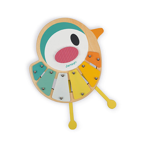 A lovely 6-note xylophone shaped like a small bird featuring very soft, modern colors. Its legs become sticks that can also be stored inside! With anti-skid feet for greater stability.