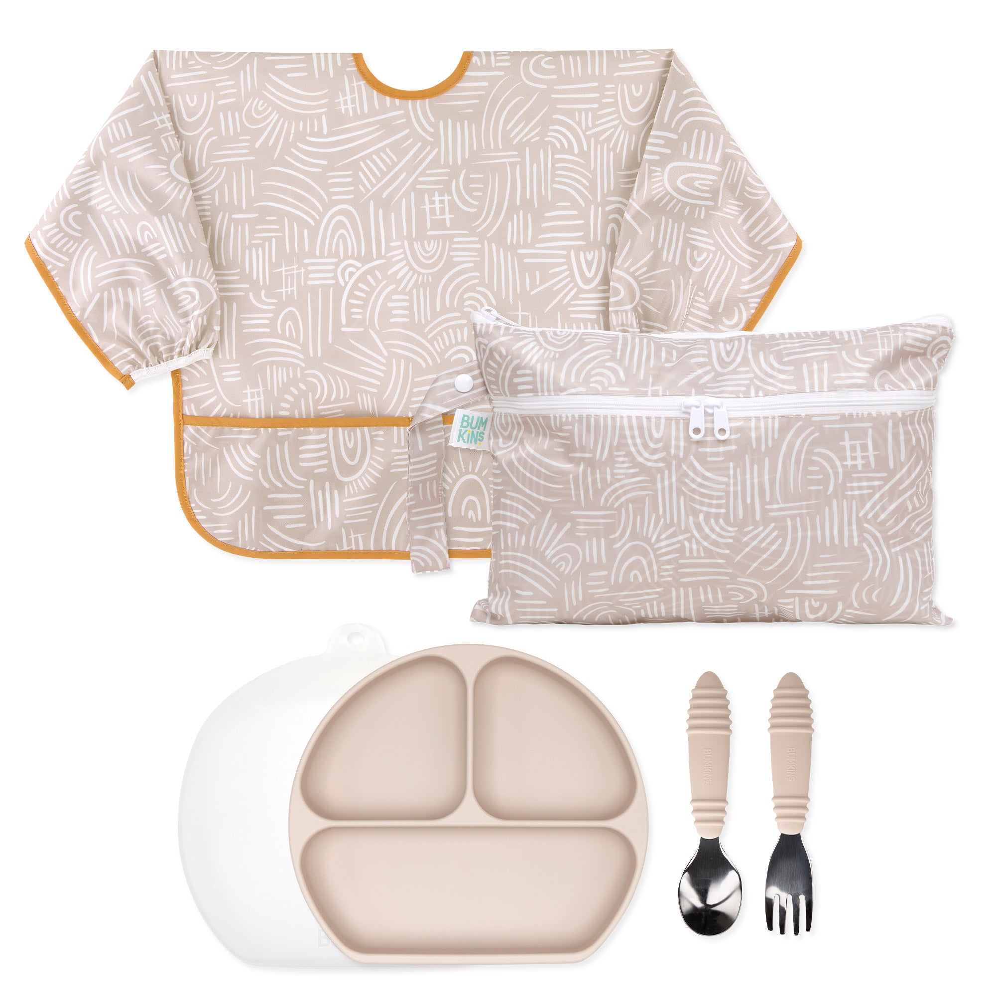 This complete set includes a Sleeved Bib, a Wet/Dry Clutch, a Silicone Grip Dish with a matching Silicone Lid, and a Spoon + Fork Set. The waterproof bib and clutch are made from Bumkins’ signature quick-dry fabric—lightweight, durable, and machine washable—while the silicone dish and utensils are crafted from 100% food-safe platinum silicone. The dish’s strong suction base and fitted silicone lid make it easy to serve, store, and save meals with less waste. Best of all, the entire set fits neatly inside the Wet/Dry Clutch, making it your go-to kit for meals wherever life takes you.