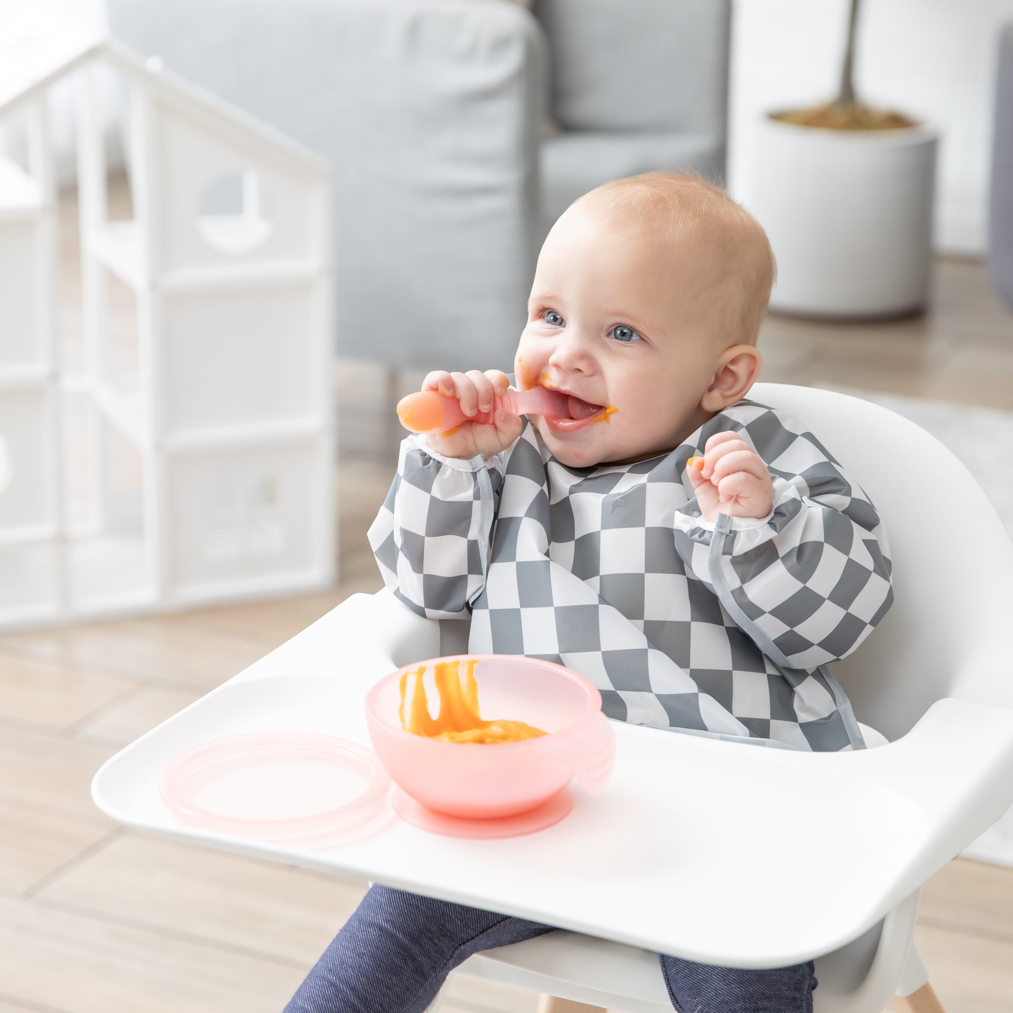In full transparency, you're going to love this Pink Jelly Silicone First Feeding Set. It's your perfect companion to introduce solid foods and transition your baby to self-feeding. The suction base keeps the bowl from sliding or flipping over. Great for use on highchair trays or tables. The easy to grip double-end silicone spoon grows with baby – one end is for dipping into purees and the other for scooping solid foods. The bowl is designed with a curved handle so mom or dad can hold and help with feeding, and the spoon is soft and safe for teething babies. The set includes a clear silicone lid with a secure fit. Ideal for saving leftovers – the clear lid allows you to easily see stored food.