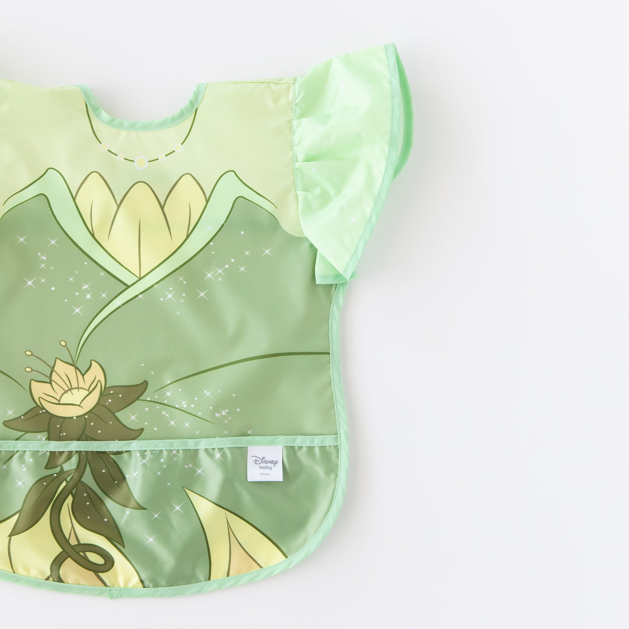 - Ruffle Apron Bib sized to fit ages 6 to 24 months
